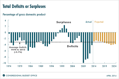 - The fiscal 2014 federal budget deficit is projected to be only $492 billion dollars, down from the $680 billion deficit recorded in 2013